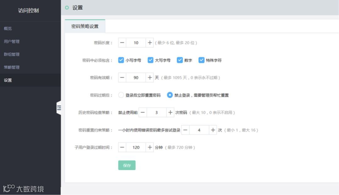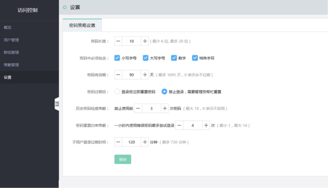 二、建议启用【密码策略设置】,要求密码长度10位以上,包含大小写字母、数字、特殊符号,并且设置密码有效期、历史密码检查策略、密码重置约束策略、子用户登录过期时间;