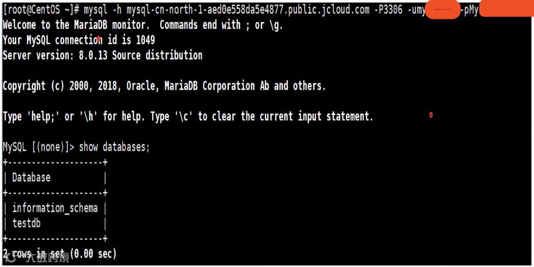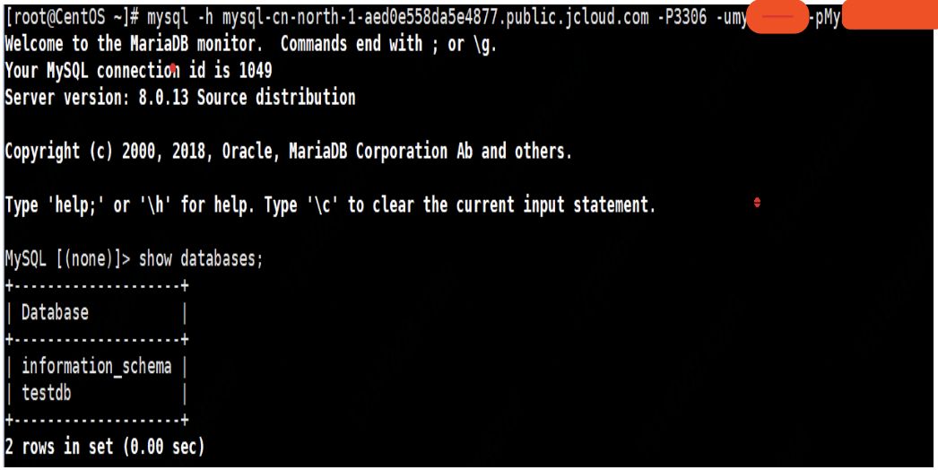 1[root@CentOS ~]# mysql -h mysql-cn-north-1-aed0e558da5e4877.public.jcloud.com -P3306 -umysqlxxx –pPasswordxxx
