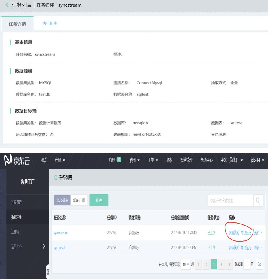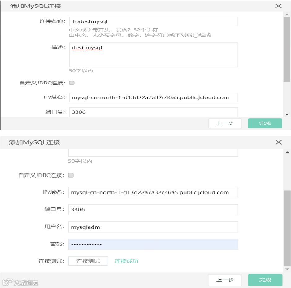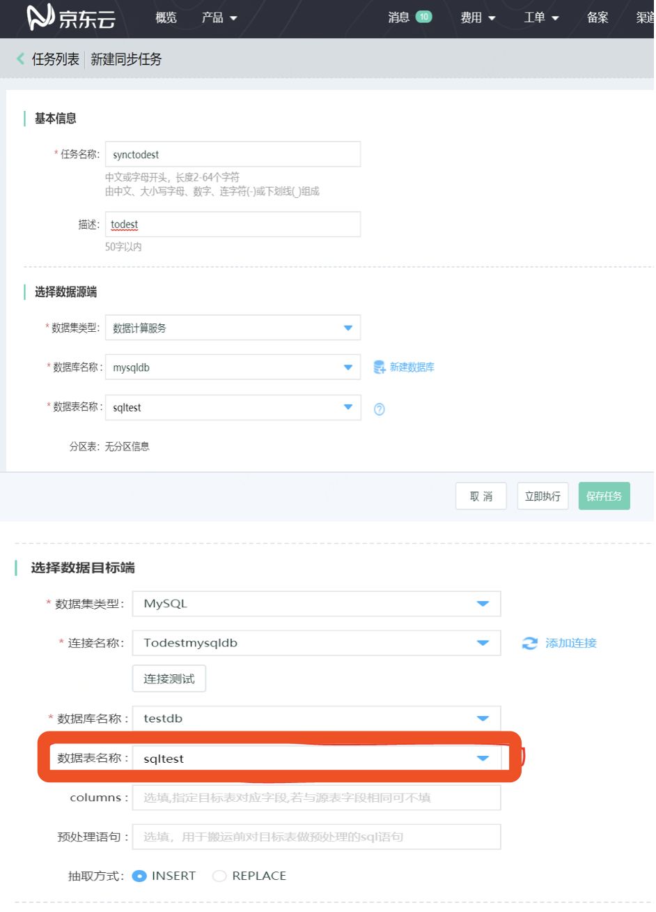 可以利用这个能力把数据工厂当作简单DTS工具,把数据传给目的数据库。本例在京东云建立一个MySQL目的数据库,把SQLTest同步给目的数据库,实现两个数据库的数据同步。