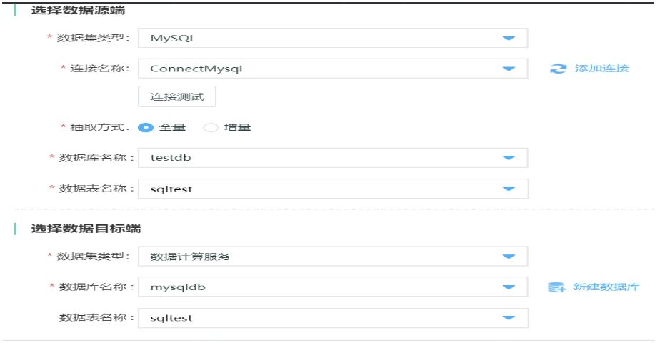新建同步任务,将数据计算服务的数据同步给destmysqldb数据库,任务名称synctodest。选择数据源端要选择大数据的数据计算服务,数据库名为mysqldb数据表名为sqltest,表的数据可以预览,避免出错。