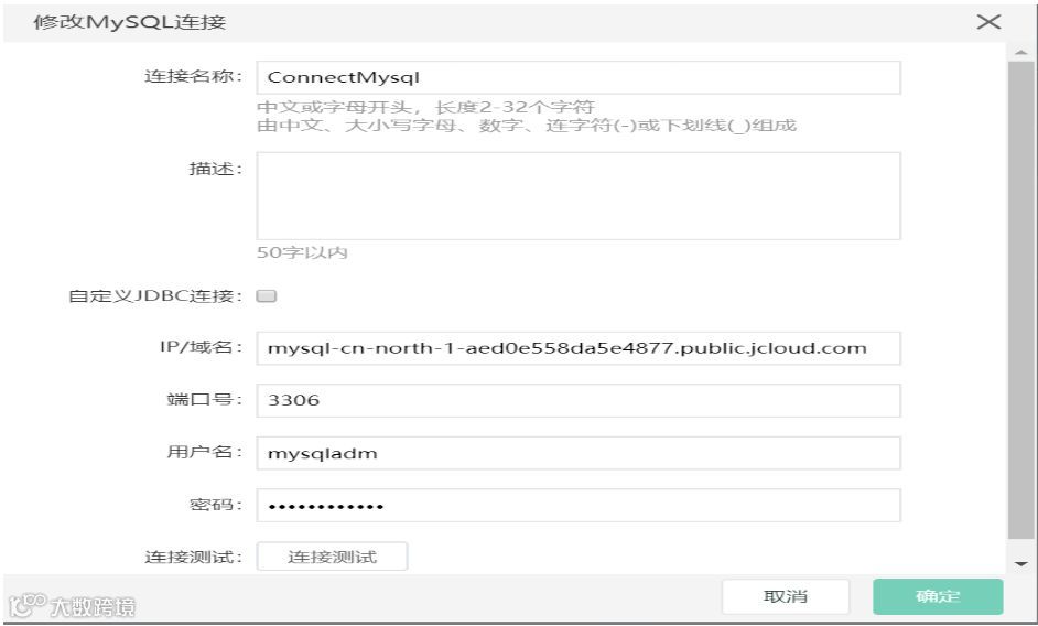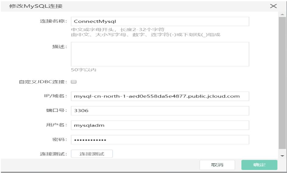 建立连接时建议点击连接测试按钮先进行测试数据库连接,不能连接时请检查域名、端口、用户名密码是否正确,数据库是否允许外网访问。