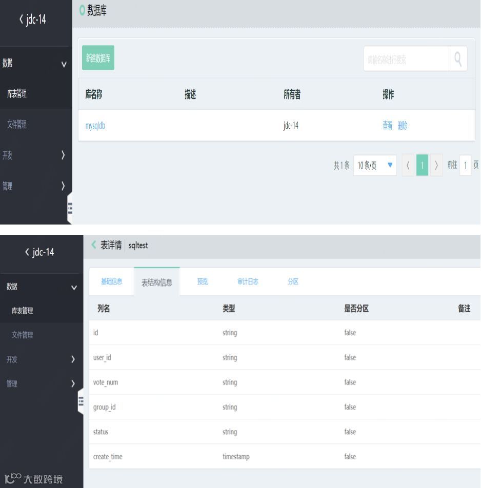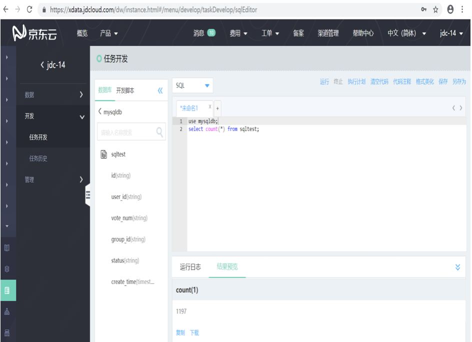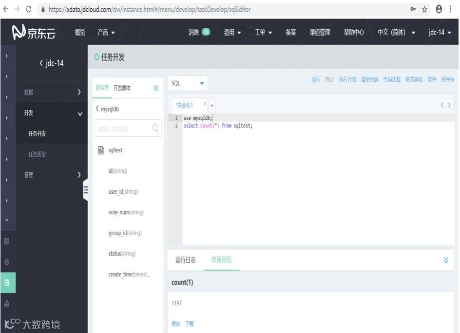 通过以上建立数据同步任务和工作流两种形式都能实现数据源的数据获取,数据获取后就可以直接使用大数据服务进行数据处理了。在大数据与分析菜单下选择数据计算服务管理。默认用自己用户名/PIN(本例用户名是jdc-14)为实例名,建立了Default HIVE INSTANCE。