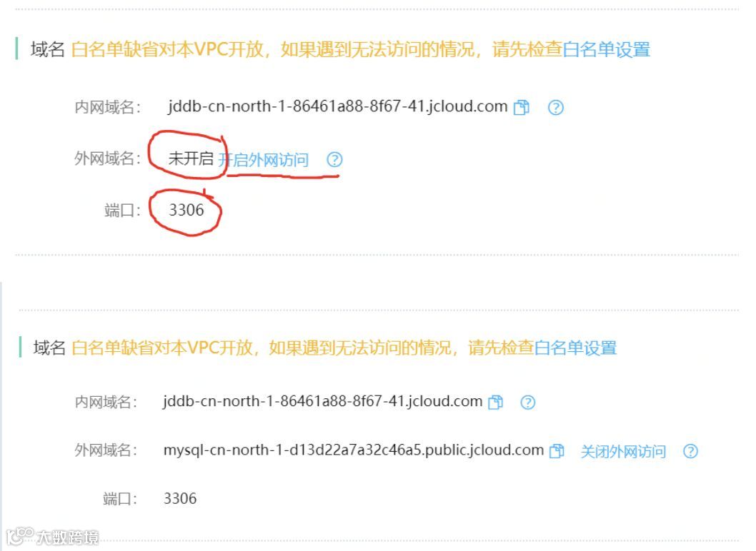 创建MySQL数据库可以通过图形界面按提示填写必要信息开通,这里不赘述。需要提醒的是数据库开通后默认不允许外网访问,要点击开启外网访问,并记住默认端口3306。