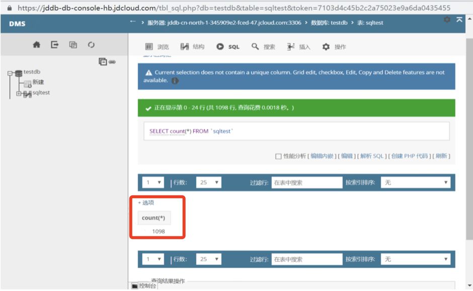 执行完毕后可以在destmysqldb中确认结果,通过select count(*) from sqltest 可以确认数据已经成功导入。