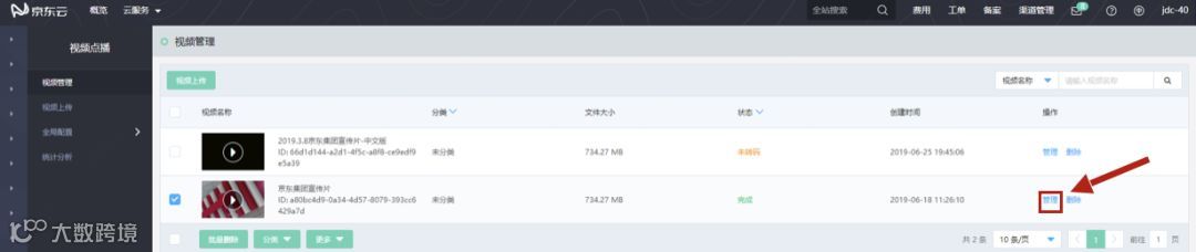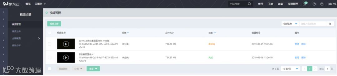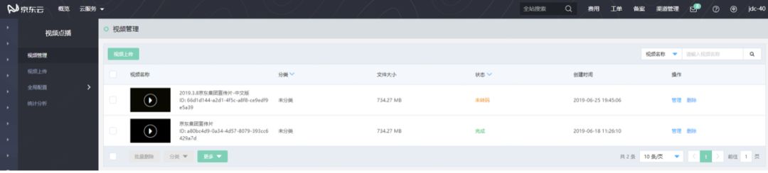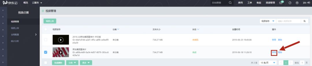 上传完毕后,可以在视频管理页面,对视频文件进行管理: