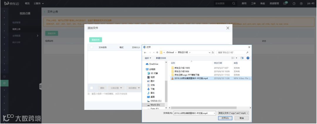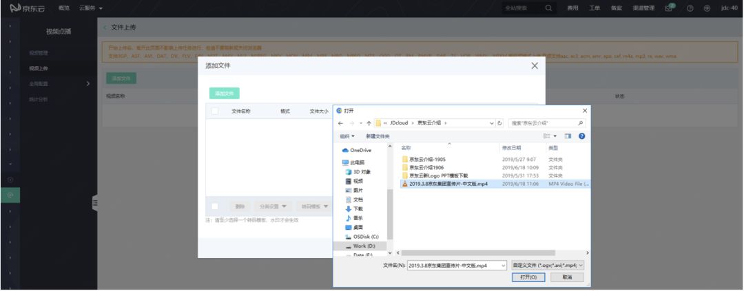 服务开通后,进入京东云控制台,进入视频服务-视频点播页面,选择“视频上传”,上传视频文件,如下图: