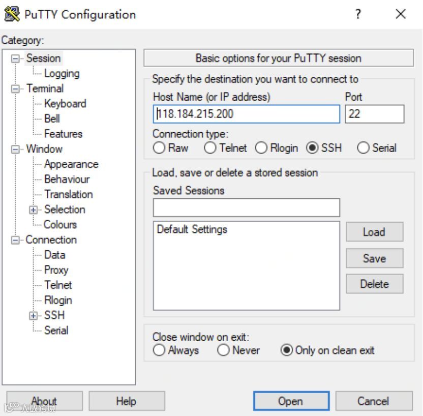 云主机购买后,我们使用SSH工具连接主机,进行配置,本文使用putty工具(putty是一个开源的Telnet、SSH、rlogin、纯TCP以及串行接口连接软件,可访问https://www.putty.org/进行下载)。