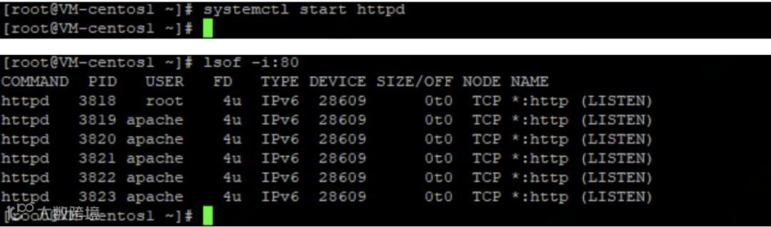 2 # lsof -i:80 --查看httpd服务是否启动