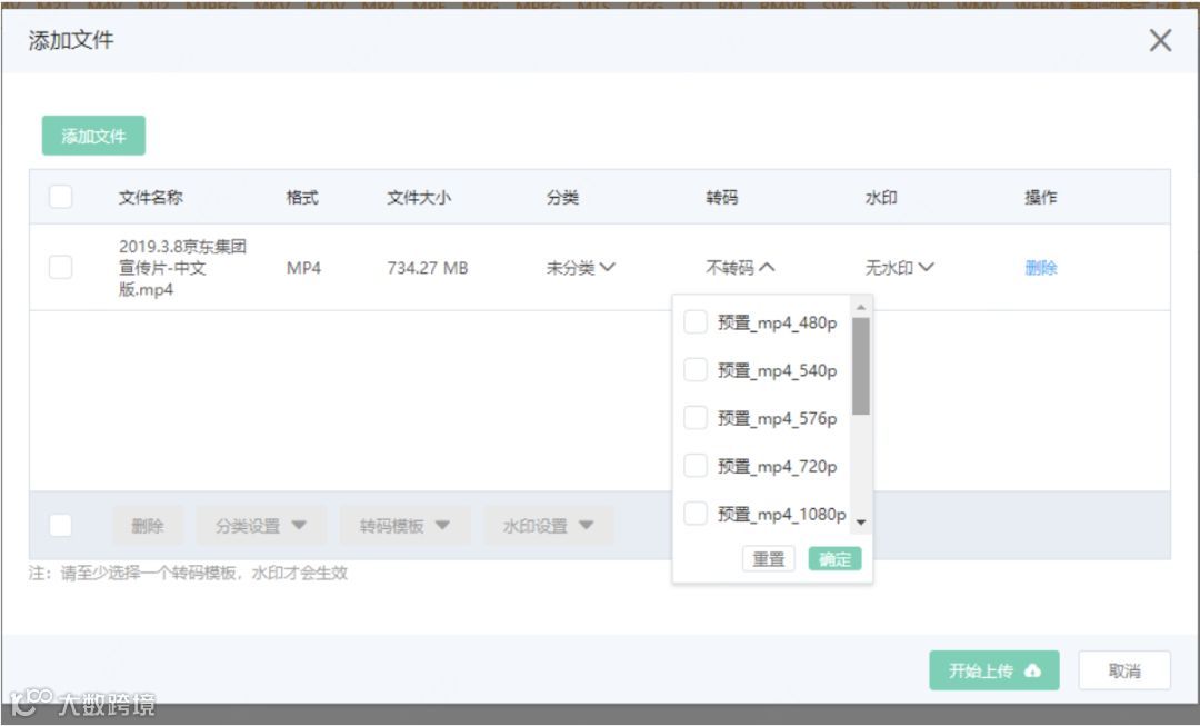 上传文件的同时,可根据需要选择转码: