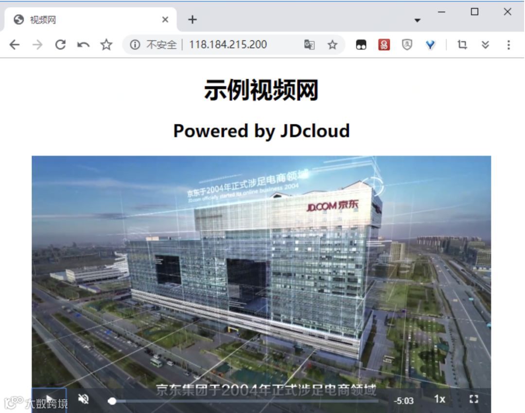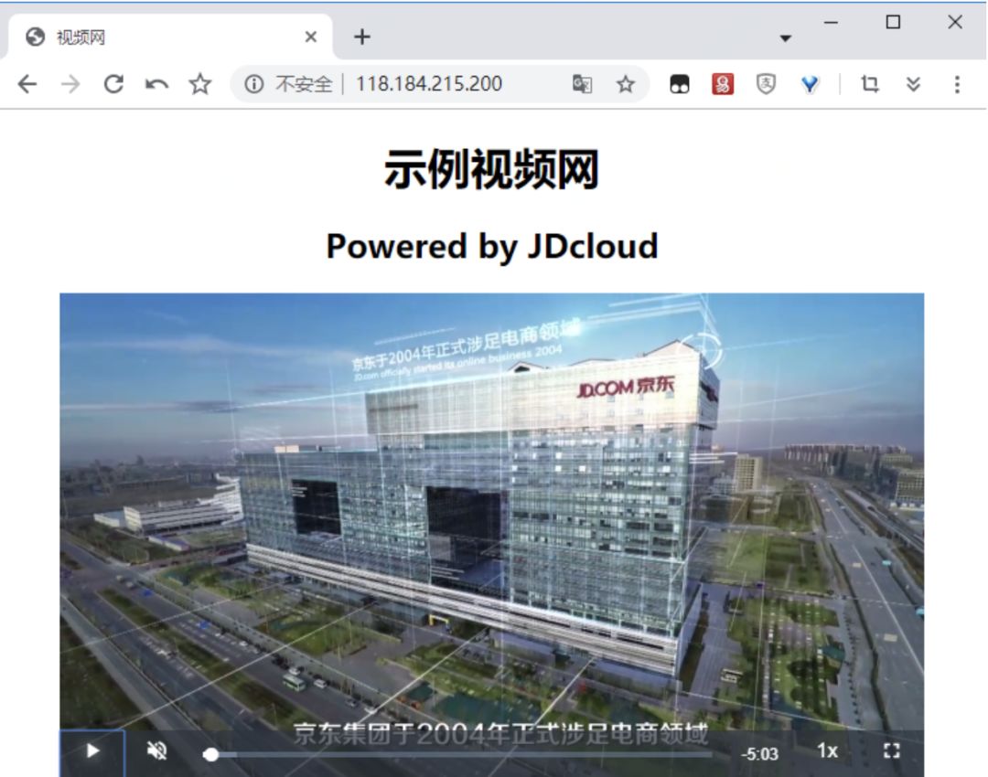 打开浏览器,输入云主机公网IP,网站显示如下,我们在视频云中上传的视频文件可以在网页中点击播放,注册域名后,将服务器IP绑定至域名,可以实现域名登录网站。
