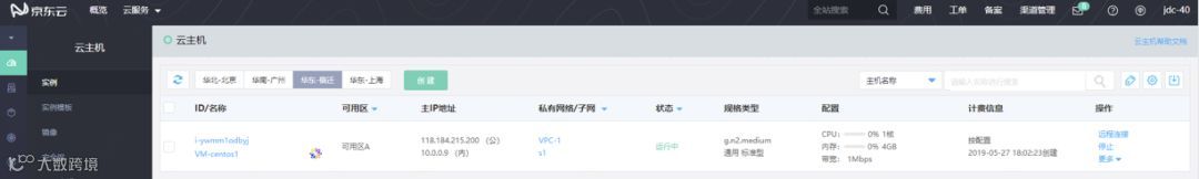 登录京东云控制台,选择弹性计算-云主机-实例,可看到购买的主机实例: