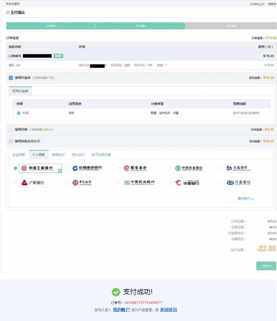 完成支付:域名属于即时产品,无法预订,只有最终付款成功才算注册成功,所以下单后请尽快结算。付款方式有多种,推荐通过网银支付,支付成功后,您可以在会员中心-域名管理中找到域名并进行管理。