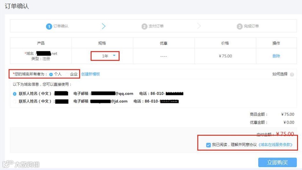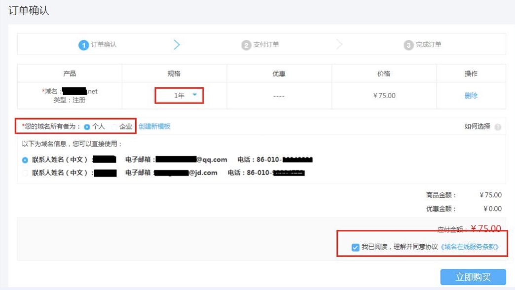 加入购物车:选择想要注册的域名,点击“立即结算”前往购物车,在购物车中,选择注册年限并勾选域名注册协议。