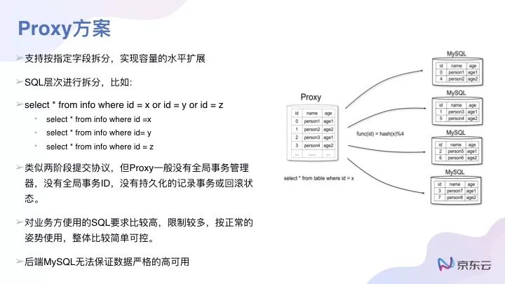 第二种方案就是Proxy方案。Proxy方案相对客户端方案而言,开发难度稍微高一些,但思路上还是非常一致的。举例说明,一张用户表,用户表的组件是ID,我们对ID的分布式key进行分布,查询具体某一个用户ID的时候其实就有一个Proxy,如果说查询这个用户ID为0,进而就知道0是存在于后台的哪一台MySQL。