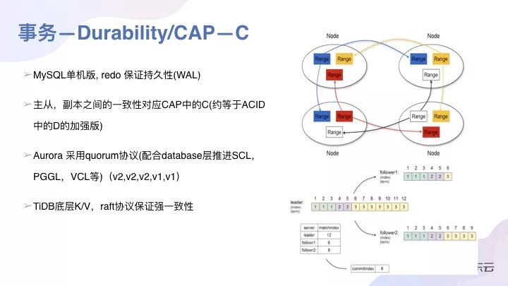它的思路很简单,就是重新去改写一些SQL,所以像F1/Spanner并不兼容MySQL的一些协议时,就会引入新的分布式事务管理,把SQL都拆解成K/V的一些操作结构,对这种方案而言,SQL的兼容性是个长期耗时而且是无限接近的一个过程,主要需兼容已有的生态会比较费力。但如果是一个新业务,用这种分布式方案就没有问题;如果是个旧业务,有自己成熟的SQL,想用它就比较困难了。