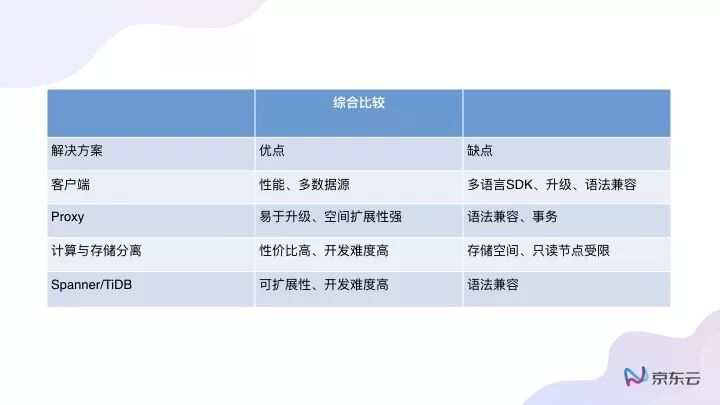 对于Proxy方案,它需要兼容原有的MySQL协议,怎么建立MySQL连接,怎么与后端保持连接,这个难度比较大。但相对而言,Proxy方案的限制也比较多,不管是客户端的表层方案,还是Proxy的表层方案,它们对SQL的使用要求都是比较高的,例如一些join是比较难支持的,而且要与业务方达成一致。