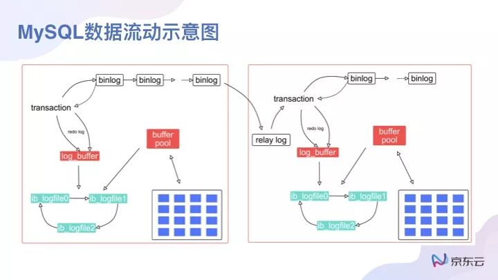 对于MySQL而言,它的数据流向会是什么样子的?第一步,如果针对一个事务或者一个SQL语句,它会写很多redo log。第二步,会写到binlog中,binlog以后会做半同步,会同步到Slave中,返回一个信息,这时候可以进行一个整体的commit。