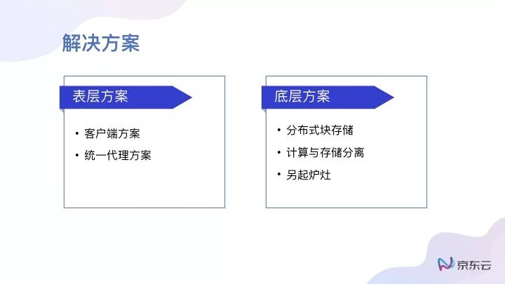 如今可知晓的底层解决方案主要有三个,第一个方案是块存储方案,包括SAN解决方案,涉及云端就是云硬盘解决方案,都是同一类型的。