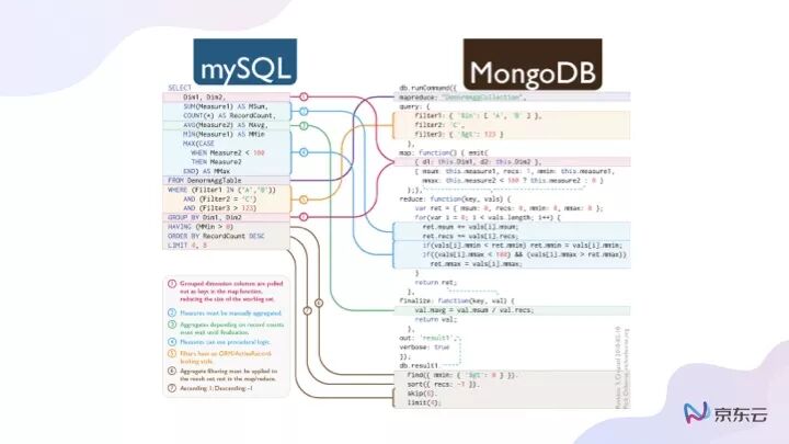 可以看到,MySQL的常见SQL语句在MongoDB中命令长度不太一样,因为所有的命令都与JSON的格式有关,包括底层的存储结构也会因为要保存JSON格式而做出很大变化。