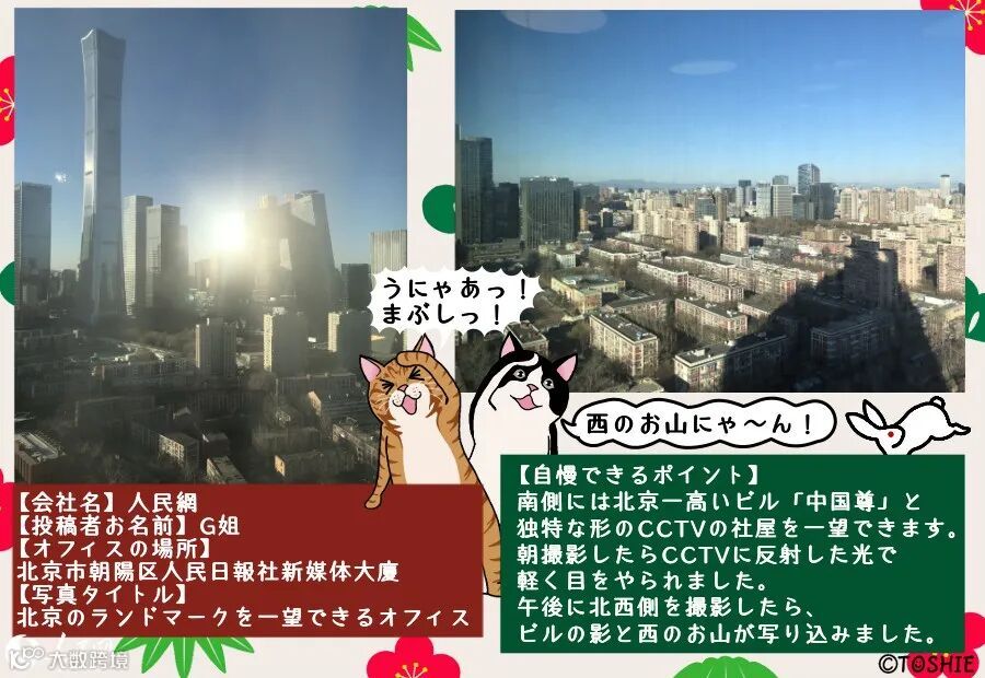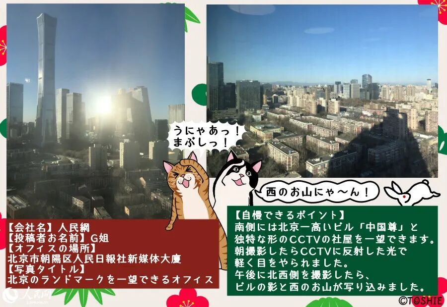 人民網では、ウチのオフィスの窓からはこんな風景またはこんなモノが見えるという自慢をしていただく「マドコレ(窓から見た風景コレクション)」を毎週火曜日に掲載中!オフィスの窓からの眺めでもよし、お仕事中の窓からの眺めでもよし、とにかく窓から眺めた様子を写した写真とそれにまつわるエピソードをご投稿ください!