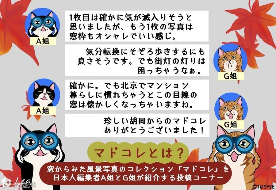 ウチのオフィスの窓からは、こんな風景またはこんなモノが見えると自慢していただく「マドコレ(窓から見た風景コレクション)」コーナー。どこまでも続く青い空や遠くに見える山々といった自然の風景から、オフィス街に建ち並ぶ高層ビルや幹線道路を走る車、庶民の暮らしが垣間見えるローカルな街並み、はたまた移動中の車窓からの眺めなどなど、高さや場所も異なれば、その窓から眺める風景も千差万別。中には仕事の意欲をアップさせてくれる元気の出る光景もあれば、疲れを癒してくれるほっこりした風景も。そんな皆さまからお寄せいただいたマドコレの数々を、毎週火曜日に、人民網日本人編集者のA姐とG姐がコメントしながら、のんびり紹介していきます。