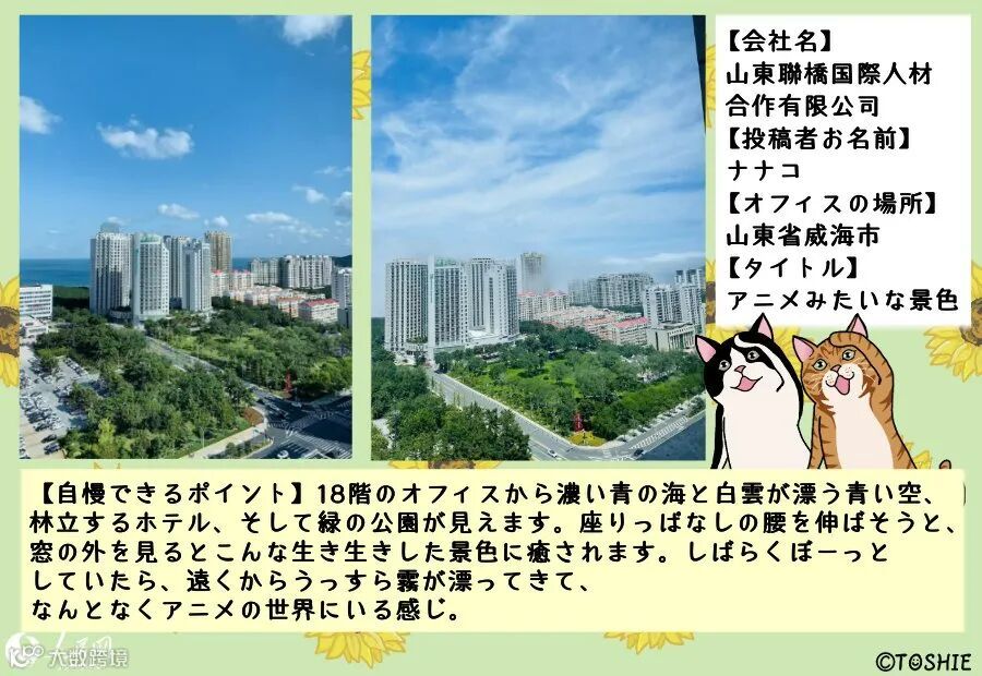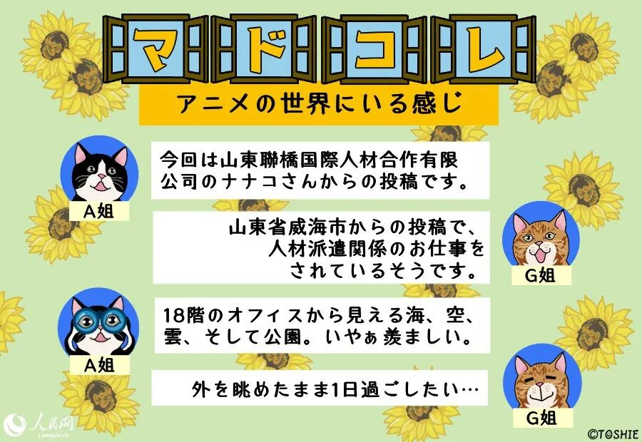 ウチのオフィスの窓からは、こんな風景またはこんなモノが見えると自慢していただく「マドコレ(窓から見た風景コレクション)」コーナー。どこまでも続く青い空や遠くに見える山々といった自然の風景から、オフィス街に建ち並ぶ高層ビルや幹線道路を走る車、庶民の暮らしが垣間見えるローカルな街並み、はたまた移動中の車窓からの眺めなどなど、高さや場所も異なれば、その窓から眺める風景も千差万別。中には仕事の意欲をアップさせてくれる元気の出る光景もあれば、疲れを癒してくれるほっこりした風景も。そんな皆さまからお寄せいただいたマドコレの数々を、毎週火曜日に、人民網日本人編集者のA姐とG姐がコメントしながら、のんびり紹介していきます。