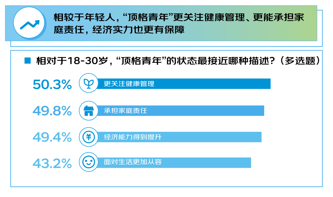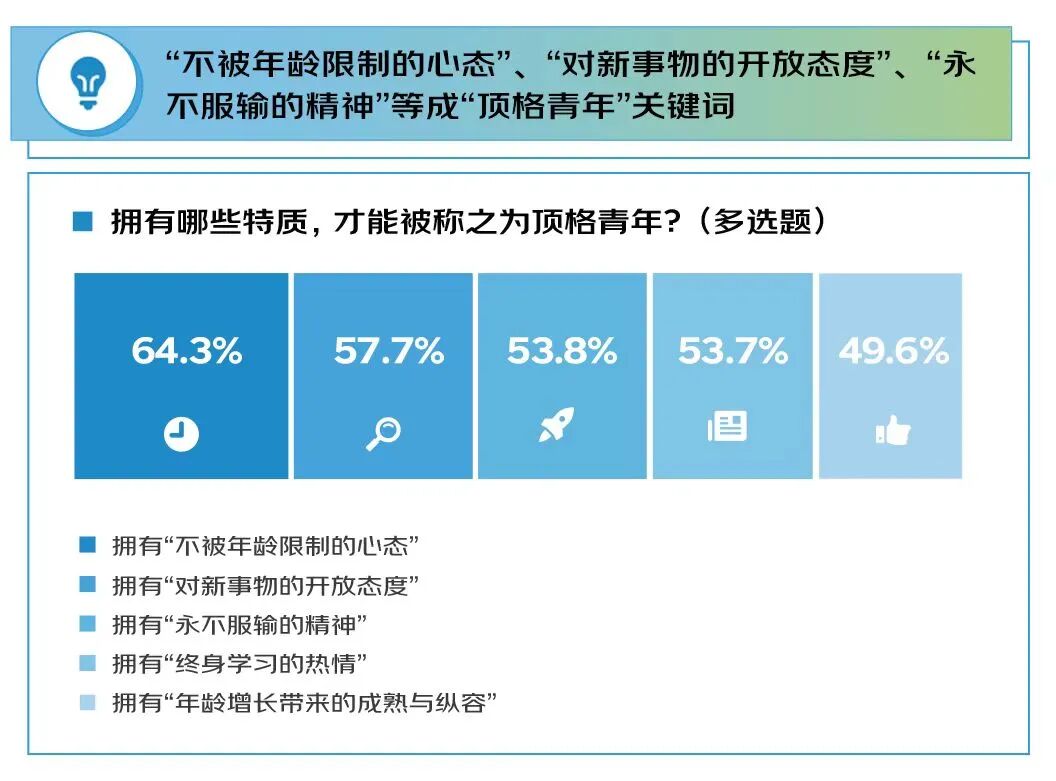 随着年龄的增长和阅历的增加,在职场上,他们可能已经成为独当一面的业务骨干;在生活中,他们可能是支撑家庭的坚实力量。但在他们当中,依然大量的人坚定地认为自己是青年,调研显示,73%的受访者愿意被称为“顶格青年”,而在“顶格青年”的特质上,64.3%的人认为要拥有“不被年龄限制的心态”,这是提及率最高的特质,“对新事物的开放态度”“永不服输的精神”“终身学习的热情”和“年龄增长带来的成熟与从容”等特质的提及率也较高。
