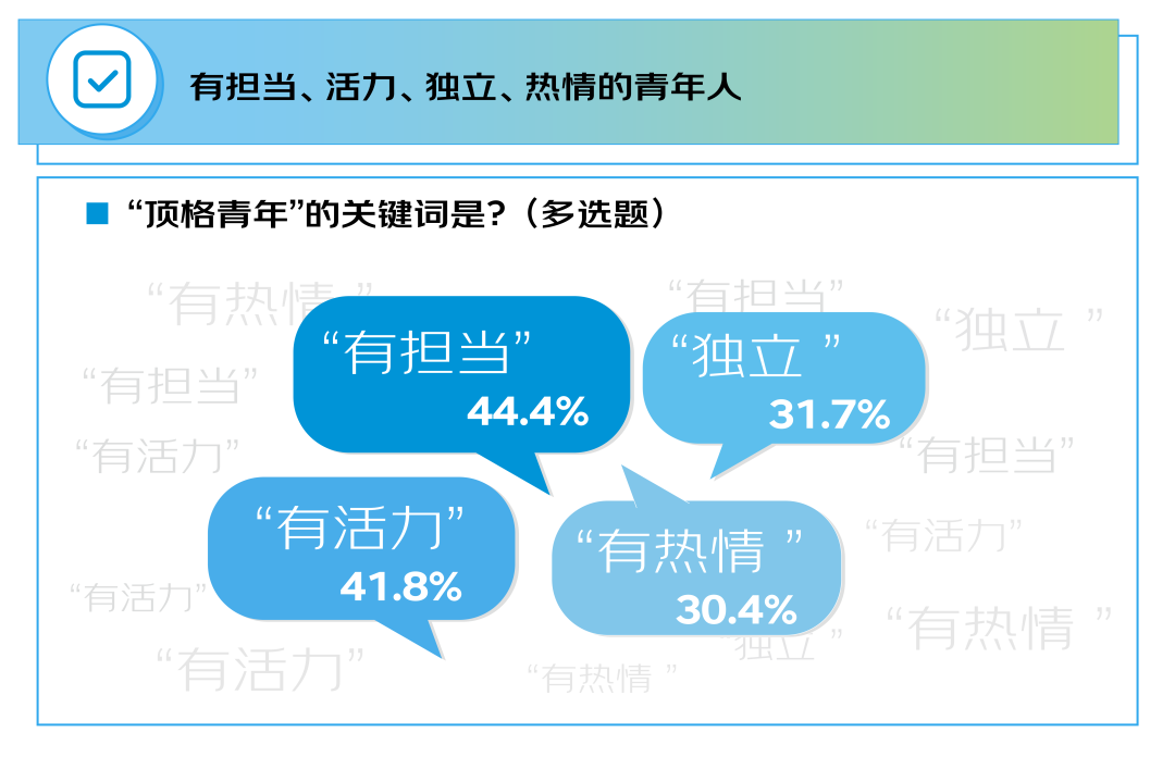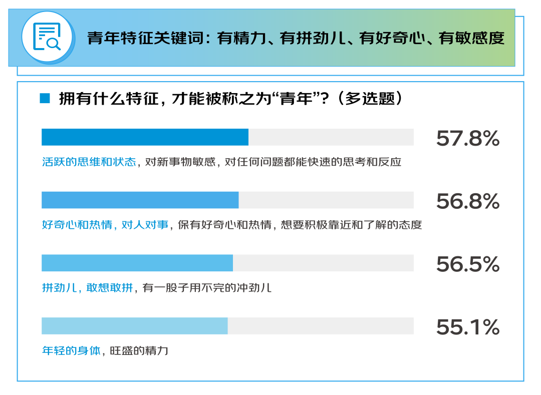 有精力、有拼劲儿、有好奇心、有敏感度成为描述青年特征的主要关键词。主要表现为 “活跃的思维和状态,对新事物敏感,对任何问题都能快速地思考和反应”“对人对事保有好奇心和热情,想要积极靠近和了解的态度”“拼劲儿,敢想敢拼,有一股子用不完的冲劲儿”“年轻的身体、旺盛的精力”。