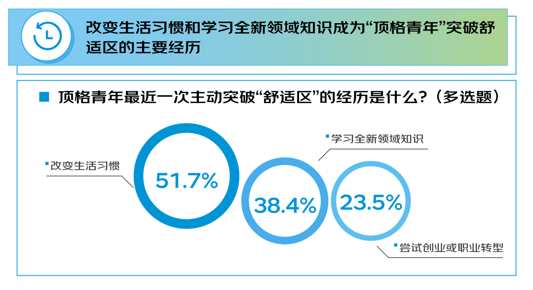 这种理性辩证的成长观,最终会内化为驱动“顶格青年”突破自我的强大力量,让更多人不断提升自我,突破舒适区,获得更好的成长发展。调研显示,改变生活习惯和学习全新领域知识是“顶格青年”突破自我边界的主要方式,用实际行动诠释成长没有边界,他们用持续的自我革新,生动演绎着拒绝停滞、不断突破极限的成长信念。