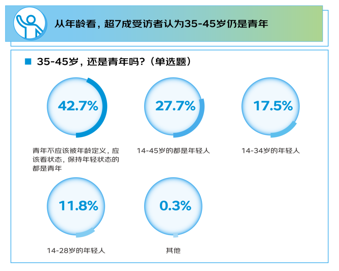 正如哲学家塞缪尔·厄尔曼所说:“青春不是年华,而是心境。”当传统年龄划分逐渐弱化,关于“青年”的认知正在发生深刻转变。调研显示,从年龄的理解上来看,70.4%的受访者认为35至45岁这个年龄段仍属于青年范畴,其中,42.7%的受访者认为“青年不应该被年龄定义,应该看状态,保持年轻态的都是青年”,还有27.7%的受访者认为青年的年龄段就是14-45岁,所以35-45岁就是青年。