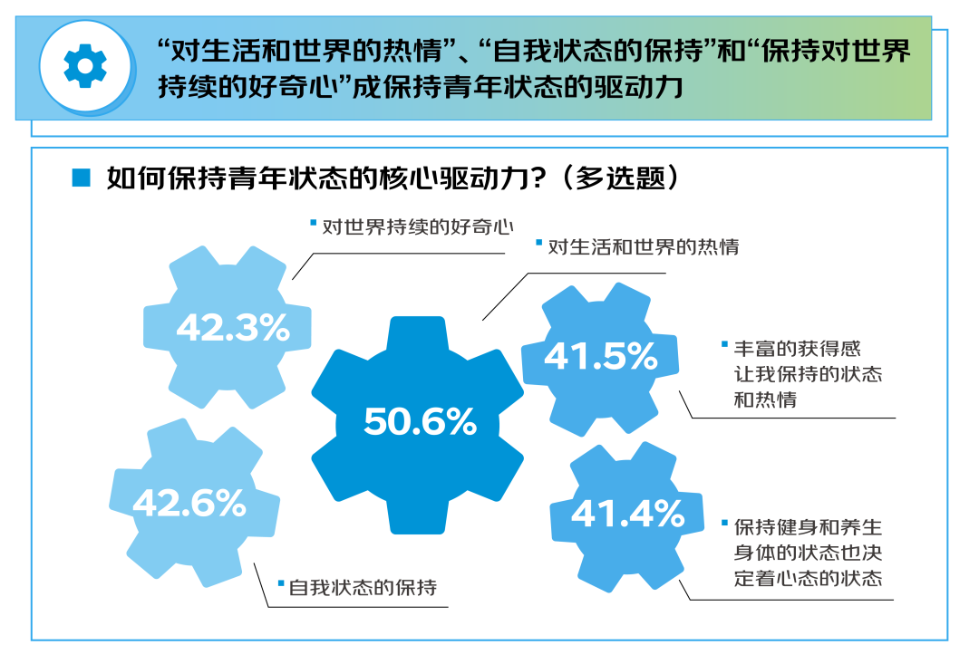 有精力、有拼劲儿、有好奇心、有敏感度成为描述青年特征的主要关键词,主要表现为 “活跃的思维和状态,对新事物敏感,对任何问题都能快速地思考和反应”“对人对事保有好奇心和热情,想要积极靠近和了解的态度”“拼劲儿,敢想敢拼,有一股子用不完的冲劲儿”“年轻的身体、旺盛的精力”。35-45岁的“顶格青年”人群将“保持热情、保持个人状态、保持好奇心”视为延续青年内核的驱动力。