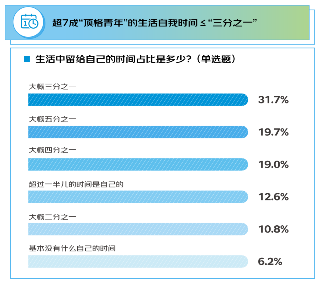 在工作与家庭生活的羁绊下,“顶格青年”在时间分配的夹缝中不断寻求自我空间。调研显示,工作和孩子是占据生活精力的两大核心,31.7%的受访者坦言,投入在“自我”上的时间为全天总时间的大约1/3,而选择1/4-1/5的比例也较高,当然也有部分人群的自我时间能够超过1/2。但不管如何,在对话中能清晰地感受到,随着阅历的增长,许多“顶格青年”在工作、家庭与自我之间逐渐找到了更从容的应对方式:一位80后二孩妈妈在谈及她的工作项目、育儿任务与自我投资三线并行状态时表示,“不管工作和孩子让我多忙,我都会给自己一个空间,去持续地学习、去运动,甚至去跳舞,我会以个人兴趣为出发点去盘‘自我时间’,因为在我是“孩子妈妈”这个身份之前,我首先是‘我自己’。”