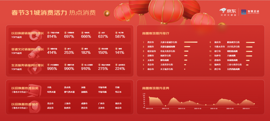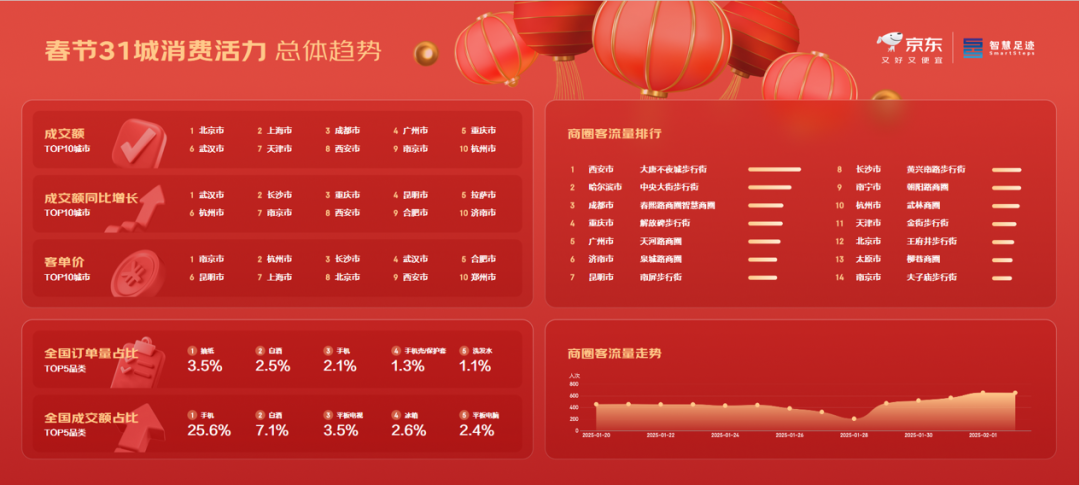 与此同时,全国各大商圈也纷纷通过丰富的业态和创新的消费场景,将自身打造成春节假期的热门地标。观察显示,西安大唐不夜城商圈、哈尔滨中央大街、成都春熙路、重庆解放碑和广州天河路商圈的客流量较高。从客流量提升情况来看,西安大唐不夜城、贵阳北部金融城、哈尔滨中央大街等商圈逐渐受到越来越多消费者的关注,成为今年春节期间的“新晋顶流”。