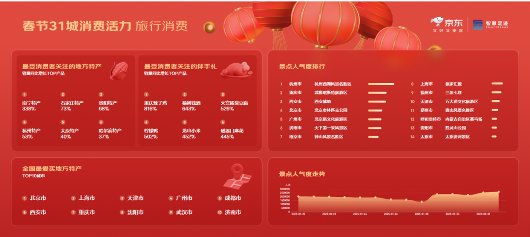 2025年春节迎来“最长假期”,人们外出旅游的热情被充分激发。京东携手联通数智智慧足迹,对全国31个省会城市、自治区首府和直辖市的景点客流量及旅行消费进行了实时统计,反映出消费者对城市旅行及地方特产的钟爱。