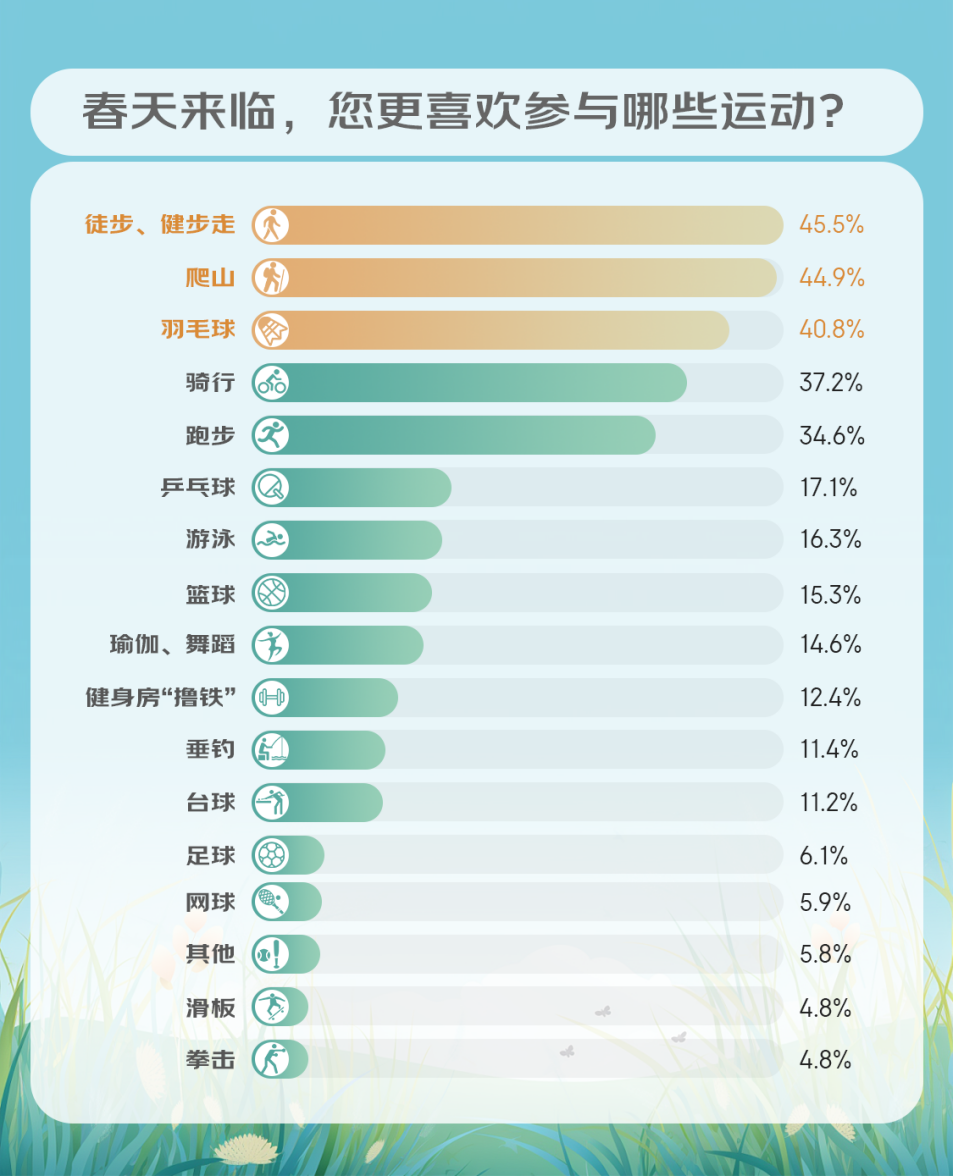 在选购运动装备时,这届年轻人呈现出更为务实理性的消费态度。调研显示,65.4%的受访者会按照自己的水平匹配合适的装备,48.9%的受访者表示只需要基础装备即可。与此同时品牌的号召力也不容小觑,37.5%的受访者会根据自己的品牌喜好选择产品。在运动项目的选择上,年轻人更为热衷爬山、徒步/健步走和羽毛球这三项运动。