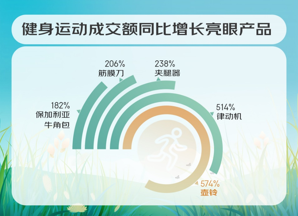 “观察”显示,家用跑步机、磁控动感单车、跳绳、筋膜枪、椭圆机成为更受消费者关注的健身训练类产品。同时,健身爱好者在装备和器材的准备上也更加专业,壶铃、律动机、夹腿器、筋膜刀、保加利亚牛角包等专业健身运动产品成交额同比增长亮眼,分别达574%、514%、238%、206%、182%。