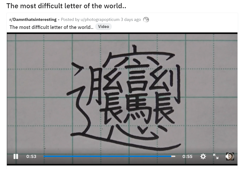 中国人でさえ超難読と感じるこの漢字が最近、「Reddit」で突然話題になり始めた。その火付け役となったのが、ウ冠から書き始め、1分ちかくかけてようやくこの漢字1文字を書き終えることができた様子を写した動画だった。