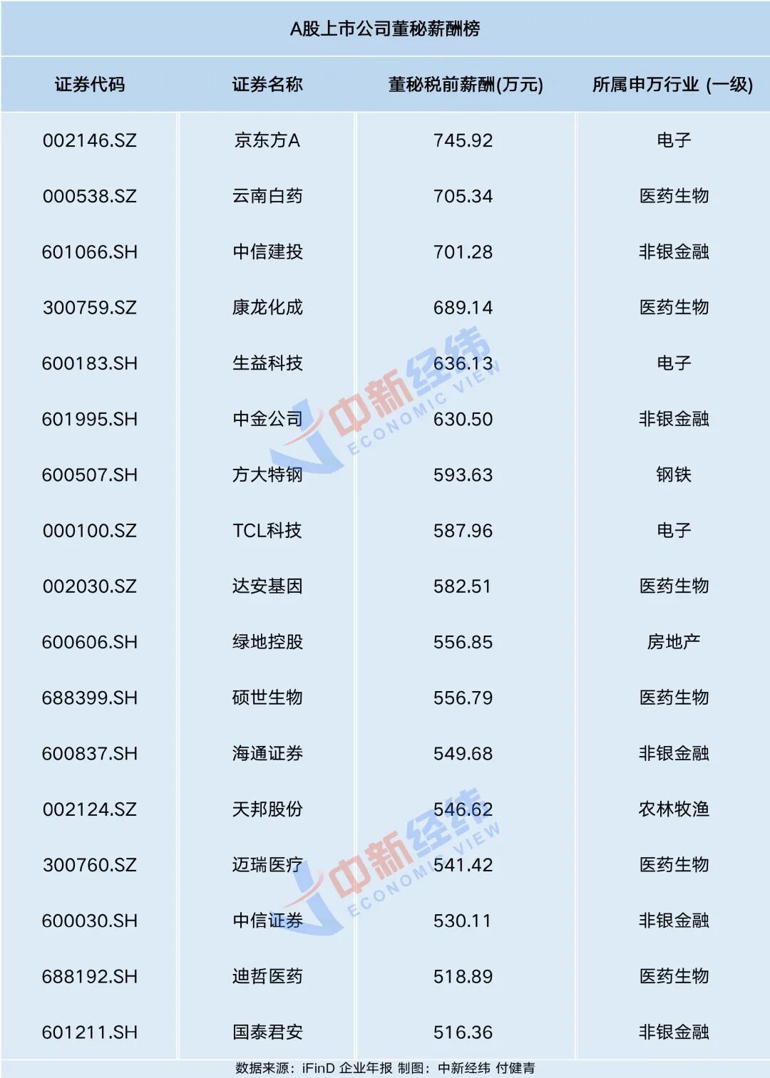 21年には、京東方A、雲南白薬、中新建投証券の3社が取締役秘書の収入が700万元を超えて上位3位に並んだ。康竜化成、生益科技、中金公司は600万元を超えた。また業界別に見ると、500万元以上の企業の大半は電子、バイオ医薬品、銀行を除く金融業などに集中した。