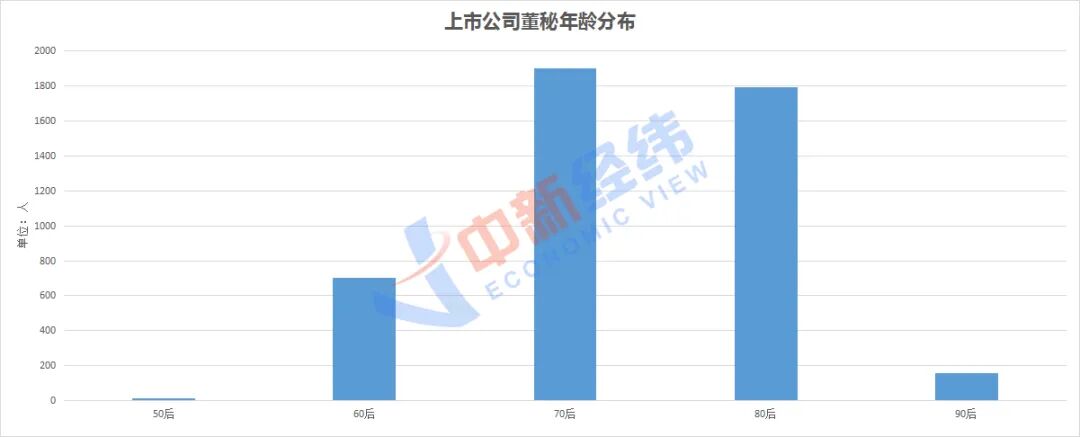 A株上場企業の取締役秘書の年齢構成を見ると(未公開の企業を除く)、「60後(1960年代生まれ)」が徐々に舞台から姿を消し、「70後(1970年代生まれ)」と「80後(1980年代生まれ)」が最も活躍し、「90後(1990年代生まれ)」が徐々に頭角を現すようになった。最年長と最年少を見ると、最年長は艾布魯の殷明坤さんで1950年生まれ、最年少はST文化の黄逸芝さんで1996年生まれだ。
