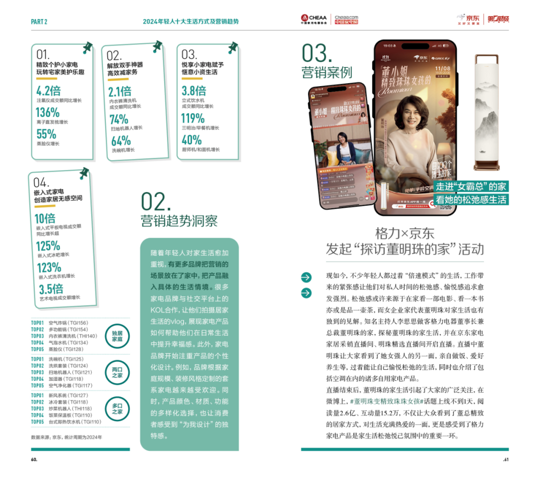 再如,京东联合格力探访了格力电器董事长兼总裁董明珠的家,首次展示了其女强人形象以外的另一面,精致的家居布局、充满生活味道的烹饪和养生分享,充分表达了其对生活的热爱。此次营销活动,不仅让大众看到了董总精致的居家方式,更是感受到了格力家电产品是家生活松弛悦己氛围中的重要一环。