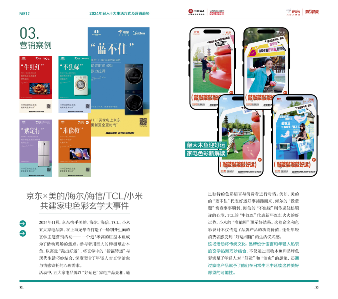 报告指出,2024年京东基于对年轻人生活方式的洞察,携手品牌方推出诸多创新营销案例,例如京东联合美的、海尔、海信、TCL、小米品牌策划了一场“家电色彩玄学营销”,组织大家在上海龙华寺敲大木鱼,寓意“敲出好运”。参与活动的家电品牌携众多“好运色”家电产品亮相现场,如美的的“蓝不住”代表好运,海尔的“没蓝题”寓意顺利,海信的“不焦绿”传递轻松顺遂的心境,TCL的“牛红红”代表红火运势,小米的“准能橙”预示好结果。这些独特设计满足了年轻消费者对“好运”和“治愈”的想象,将家电产品与延续美好生活的寓意联系在一起,活动别出心裁,吸引了大量游客驻足参观。