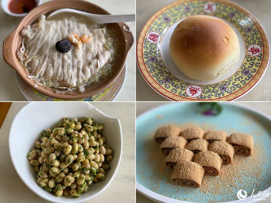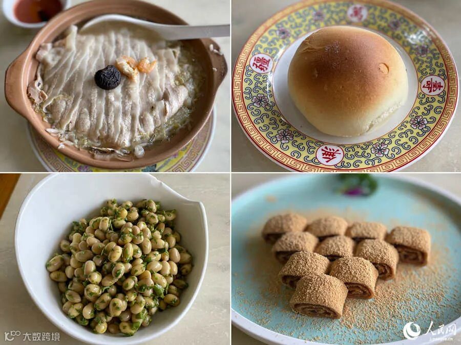 砂鍋居の看板料理「砂鍋白肉」と焼いたマントウ、香椿豆、驢打滾(撮影・勝又あや子)。