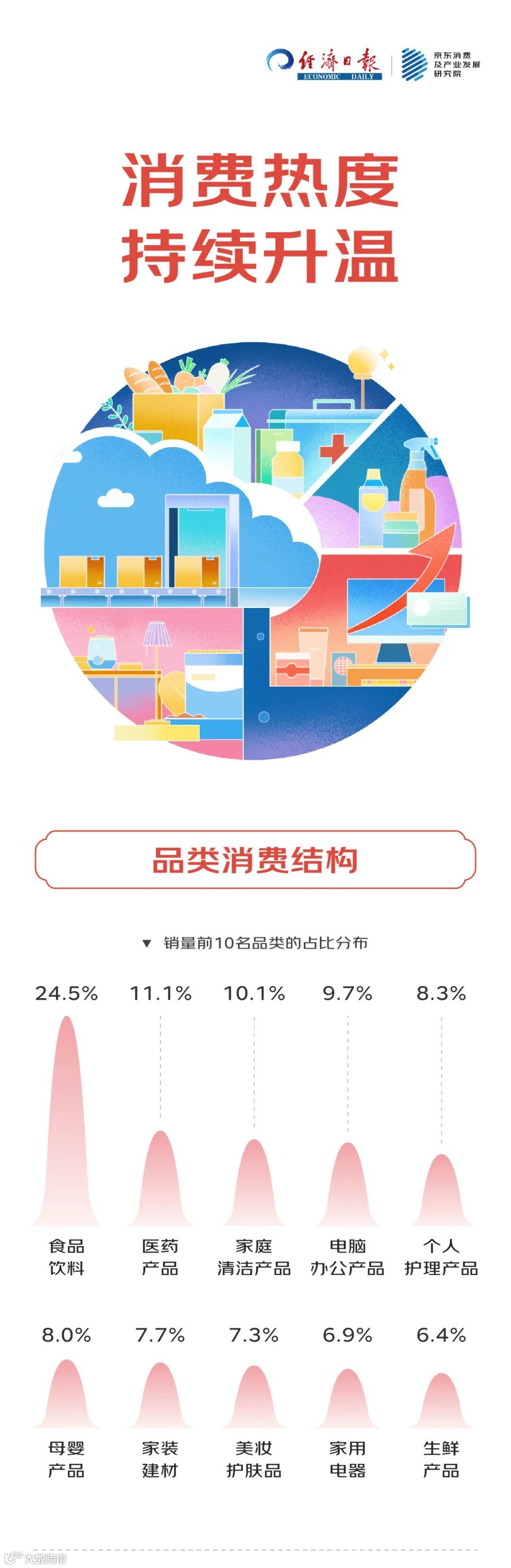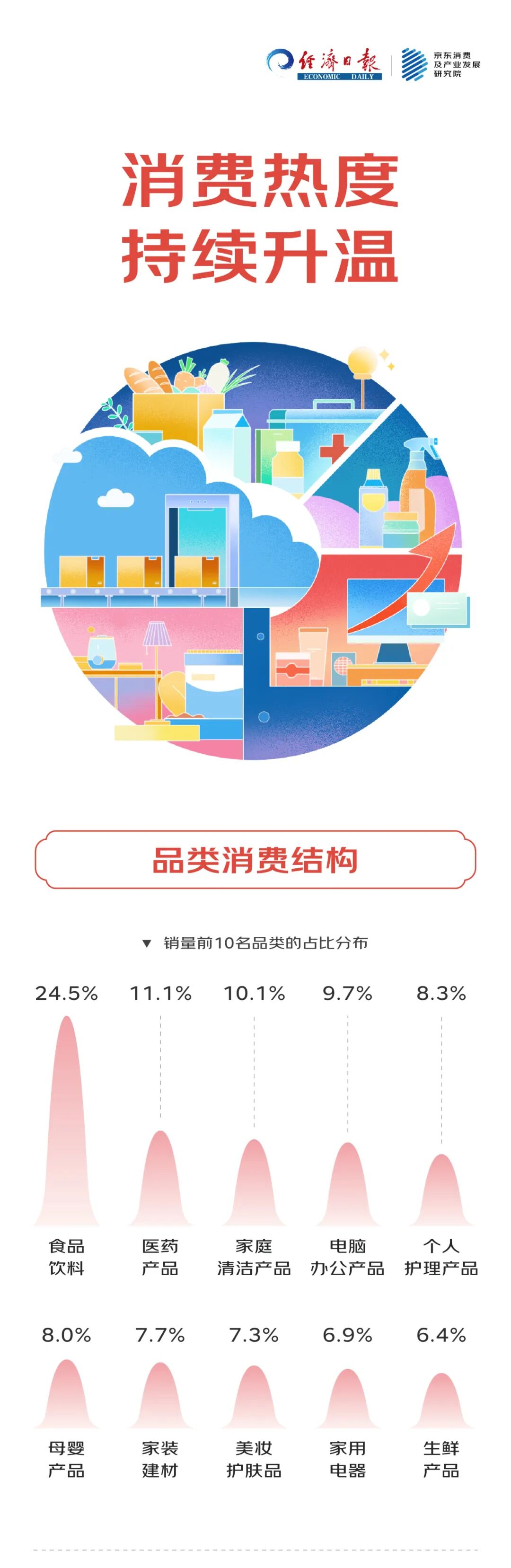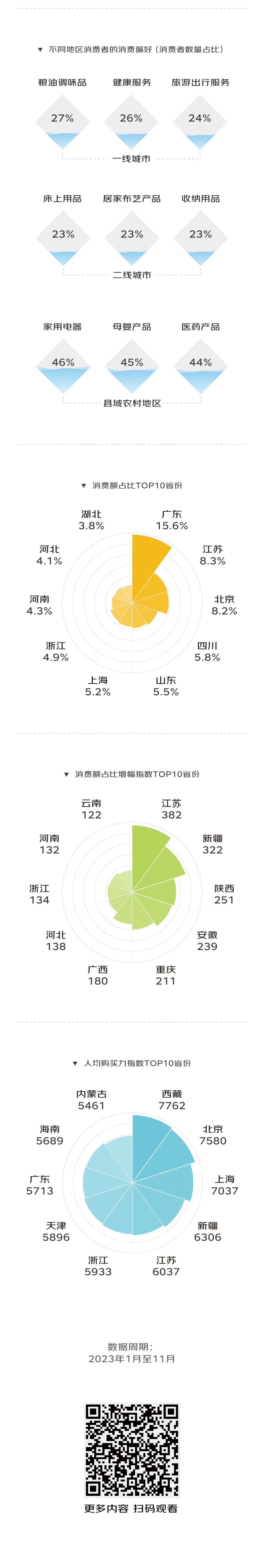从线上消费结构及变化看,2023年是重拾信心的一年。消费结构变化是消费升级的重要标志,悦己消费、健康消费、品质家居、智能科技消费等占比不断增加,代表各地消费者对美好生活的向往和追求。数据显示,食品饮料、家用电器、家清纸品、电脑数码、手机通信、医疗保健等是消费者购买较为集中的品类。其中,预制菜、婚庆节庆用品、美发造型、健康服务等多元化产品与服务收获更快增长。