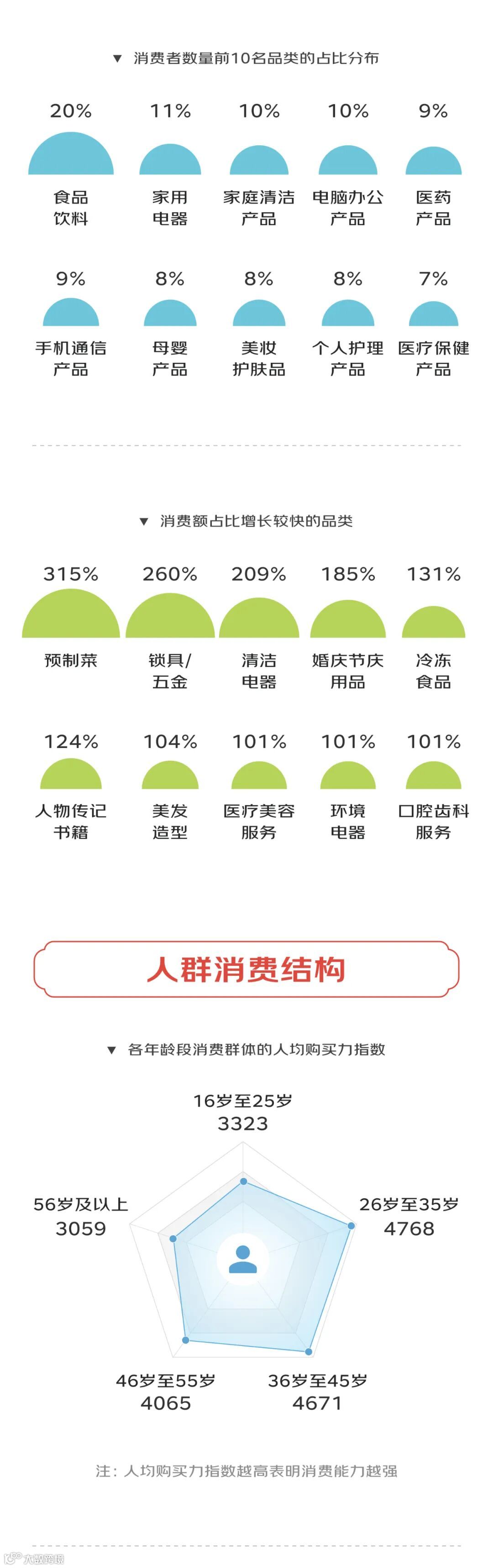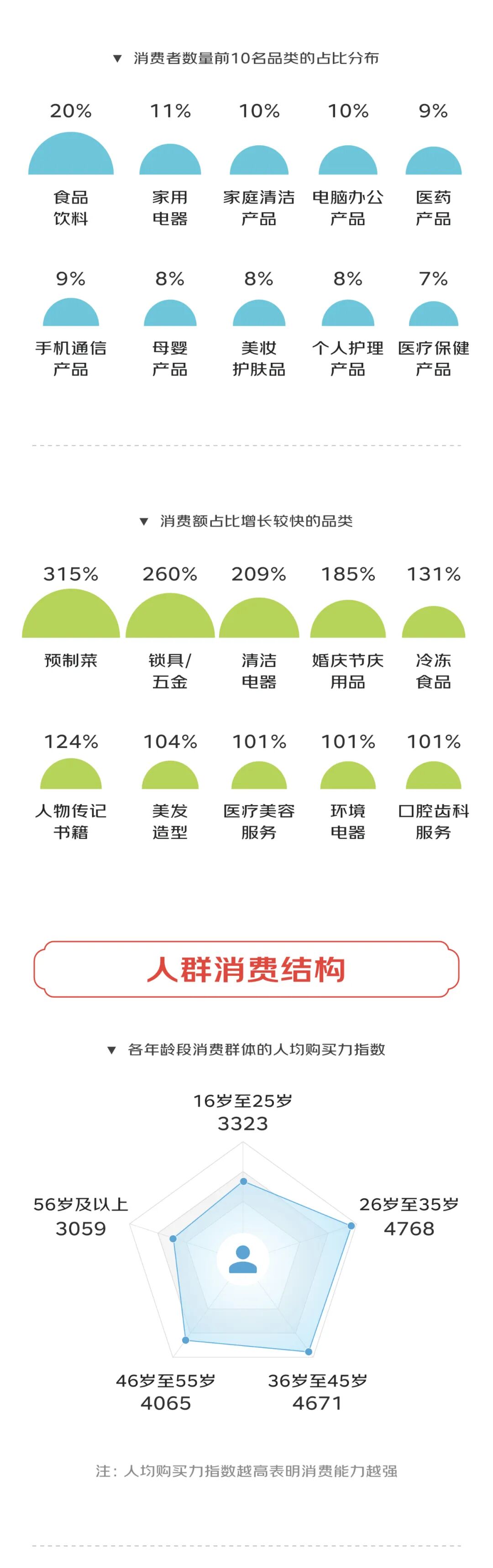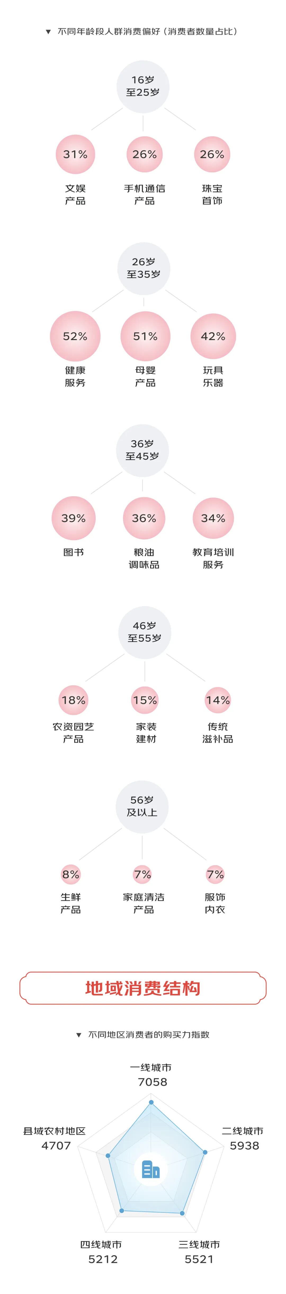 从各年龄段的人均购买力指数来看,“80后”“90后”依然是线上消费的主力。不同年龄段群体呈现出不同消费偏好,16岁至25岁的消费群体青睐悦己型消费,购买了更多文娱、首饰类产品;26岁至45岁的消费者更注重健康消费和家庭消费,偏爱购买健康服务、母婴产品和粮油调味产品等;46岁及以上的消费者更会享受生活,传统滋补品、服饰内衣等产品的消费占比较高。