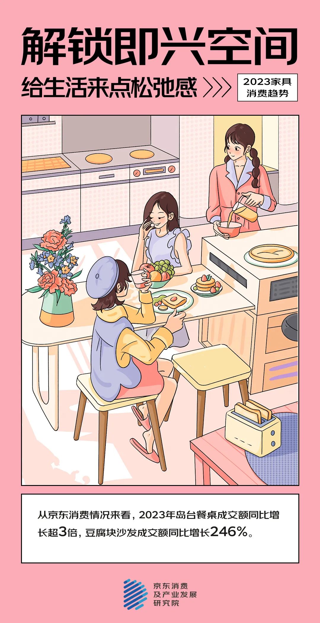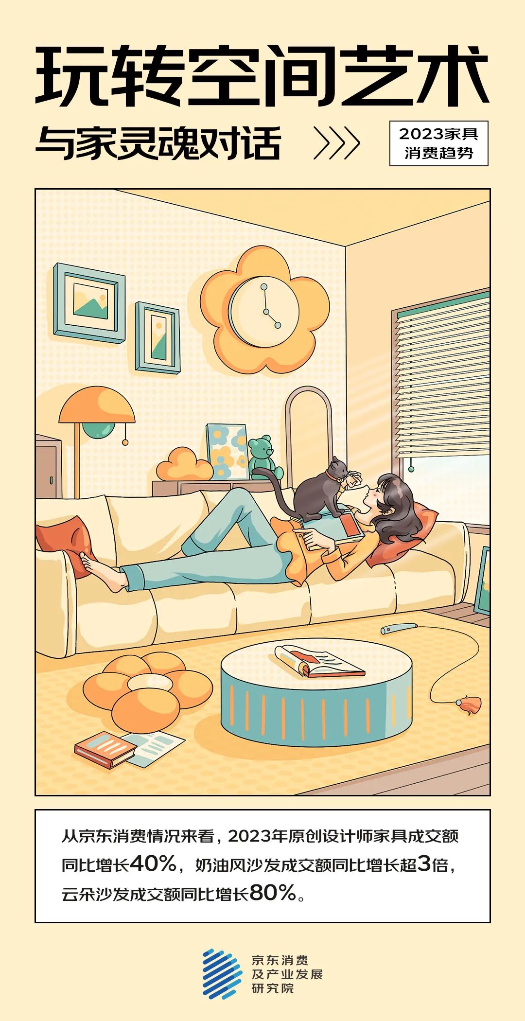 从京东消费情况来看,2023年原创设计师家具成交额同比增长40%,奶油风沙发成交额同比增长超3倍,云朵沙发成交额同比增长80%。