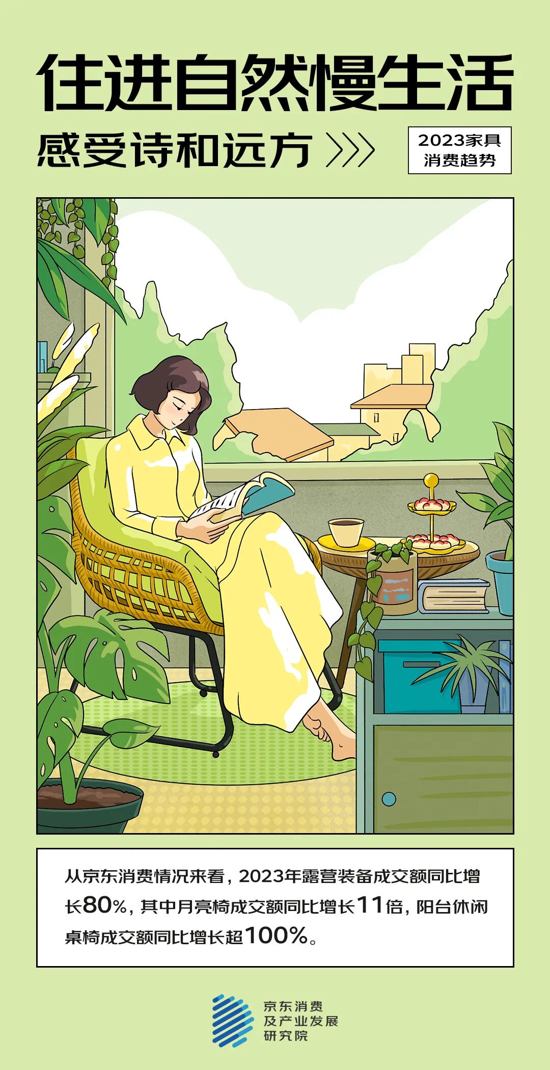 这其中,露营装备成交额同比增长80%,其中月亮椅成交额同比增长11倍,阳台休闲桌椅成交额同比增长100%。
