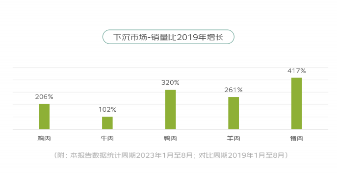 线上肉类消费趋势:居民膳食结构进一步优化,2023年1月至8月京东上的肉类销量比2019年同期增长68%。肉类的品牌数量比2019年同期增长363%,商品丰富度提升最高的是猪肉,品牌数提升482%。下沉市场的肉类消费明显增长,销量占比达到47%。