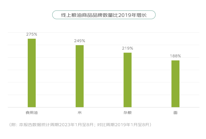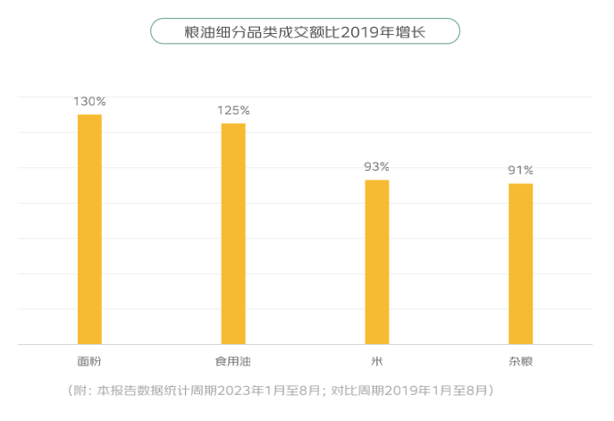 民以食为天。粮食的生产、消费与每个人的生活都息息相关。随着线上消费的迅猛发展,网购粮食逐渐成为常见化的消费趋势。2023年1月至8月,京东上销售的粮油成交额比2019年同期增长111%。其中,面粉、食用油销量增长超过125%,米、杂粮增长超过91%。