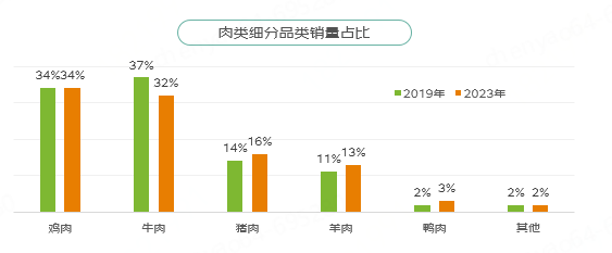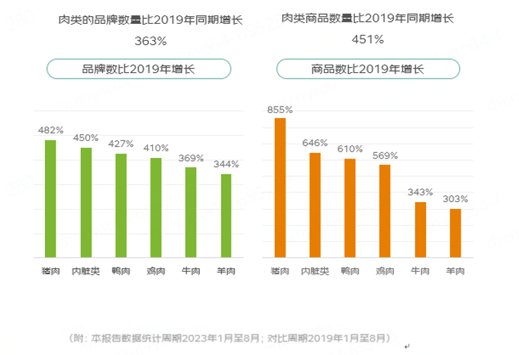 京东销售情况显示,2023年1月至8月线上销售的肉类品牌数量比2019年同期增长363%,商品数量比2019年同期增长451%。商品丰富度提升最高的是猪肉,品牌数提升482%,商品数增长855%。
