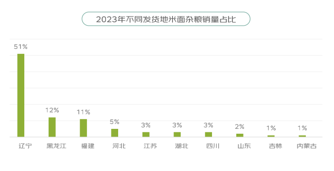 线上粮食消费趋势:2023年1月至8月京东上销售的粮油成交额比2019年同期增长111%。其中,面粉、食用油销量增长超过125%,米、杂粮增长超过91%。线上销售的粮食品牌数量比2019年同期增长233%。东北三省在京东售出的米面杂粮占全国整体销量的64%,辽宁卖出了51%的米面杂粮;山东卖出了全国51%的食用油。